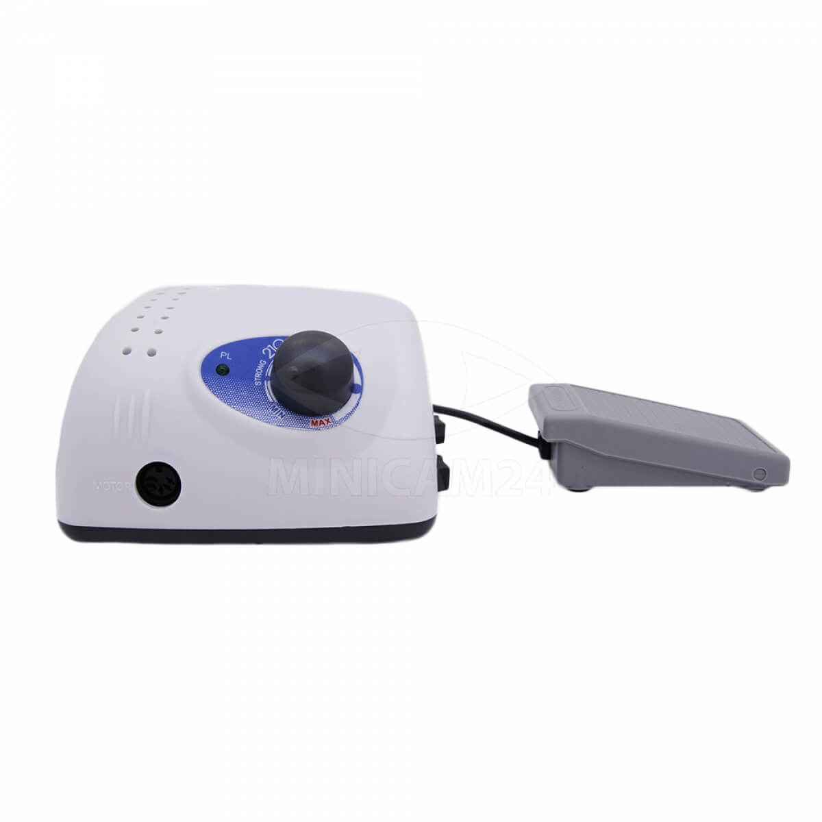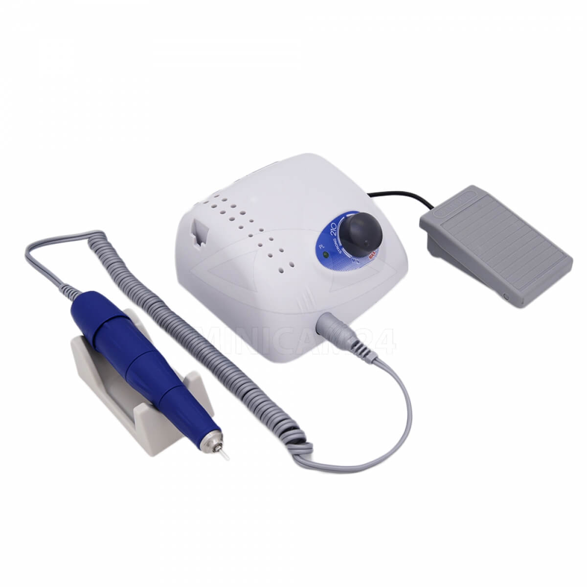 Профессиональный фрезер с реверсом и педалью. Ручка не вибрирует и не бьет в ладонь, частота вращений составляет 35 000 об/мин. Устройство оснащено системой защиты от перегрева, подходит для бесперебойной работы с большим потоком клиентов. Насадки надежно фиксируются с помощью механизма Twist Lock. Для удобства мастера блок питания может быть установлен вертикально или горизонтально. На корпусе размещены кнопки для регулировки скорости, подключения и переключения на ножное управление.