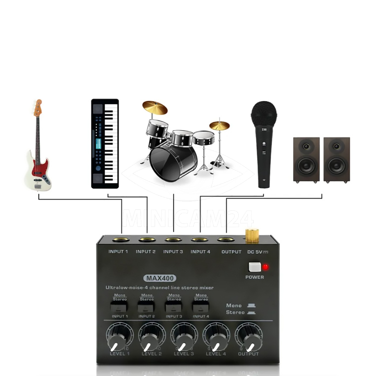 Это стереофонический 4-канальный микшер, позволяющий микшировать микрофон, гитару, бас, клавишные, электронные барабаны и т. д.